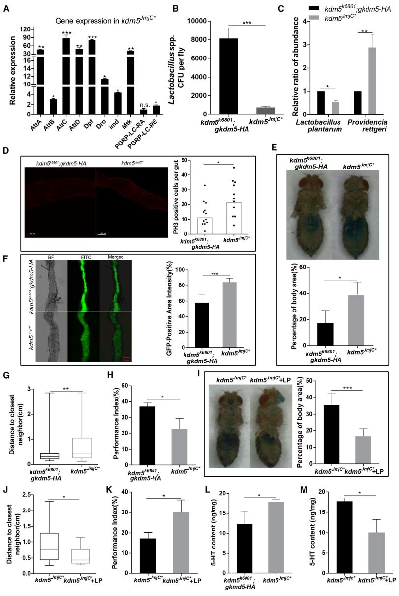 ?圖6. A:與kdm5k6801;gkdm5-HA果蠅相比,3-5日齡kdm5k6801;gkdm5JmjC*-HA(簡稱kdm5Jmjc*)果蠅腸道組織的抗菌和先天免疫反應(yīng)基因的表達(dá)(RT-PCR);B-C:3-5日齡kdm5k6801;gkdm5-HAkdm5Jmjc*果蠅腸道的乳酸菌(Lactobacillus spp)、植物乳桿菌(L. plantarum L168)、P. rettgeri P6數(shù)量(CFU/只);D:3-5日齡kdm5k6801;gkdm5-HAkdm5Jmjc*果蠅中腸PH3正染色干細(xì)胞數(shù)目;E:3-5日齡kdm5k6801;gkdm5-HA和果蠅腸滲透性評估;F:異硫氰酸熒光素(FITC)標(biāo)記的玻璃粉指示kdm5Jmjc*果蠅消化道滲透性較高;G-H:kdm5k6801;gkdm5-HAkdm5Jmjc*果蠅的接觸距離和交往活躍度比較;I-K:標(biāo)準(zhǔn)日糧與植物乳桿菌(L. plantarum L168)添加日糧對kdm5Jmjc*果蠅消化道滲透性、接觸距離和交往活躍度的比較;L:kdm5k6801;gkdm5-HAkdm5Jmjc*果蠅腹部組織的5-羥色胺(5-HT)濃度比較;M:標(biāo)準(zhǔn)日糧與植物乳桿菌(L. plantarum L168)添加日糧對kdm5Jmjc*果蠅5-HT濃度的影響。