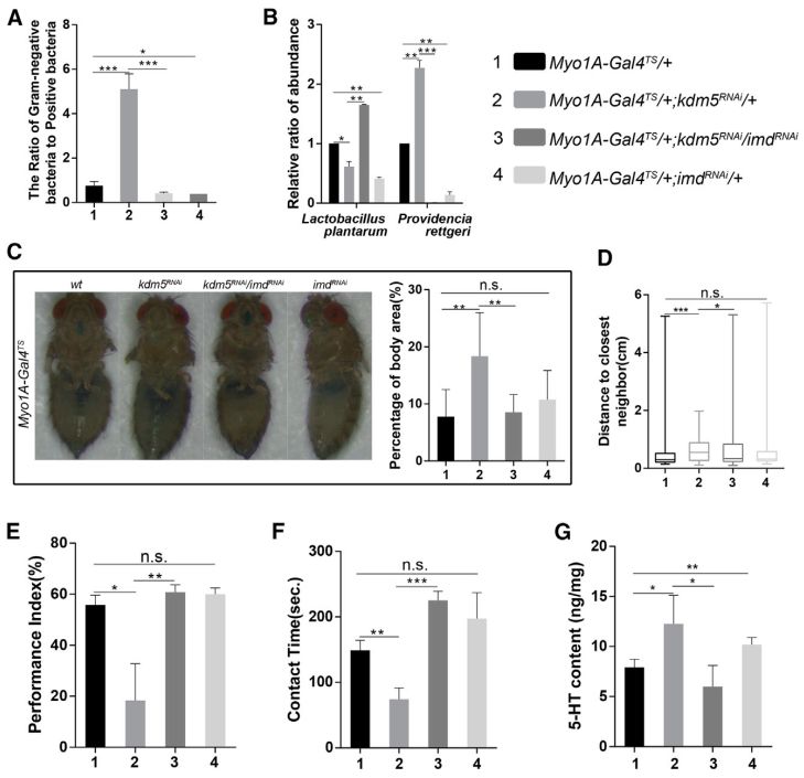 圖7. A:四組(Myo1A-Gal4TS/+、Myo1A-Gal4TS/+; kdm5RNAi/+、Myo1A-Gal4TS/+; kdm5RNAi/ imdRNAiMyo1A-Gal4TS+; imdRNA/+)果蠅的腸道革蘭氏陰性菌與陽性菌的比例;B:四組(如圖A)果蠅的腸道L. plantarum L168P. rettgeri P6相對豐度;C:四組果蠅的腸滲透性、接觸距離、交往活躍度、交往接觸時間、5-羥色胺(5-HT)濃度比較。
