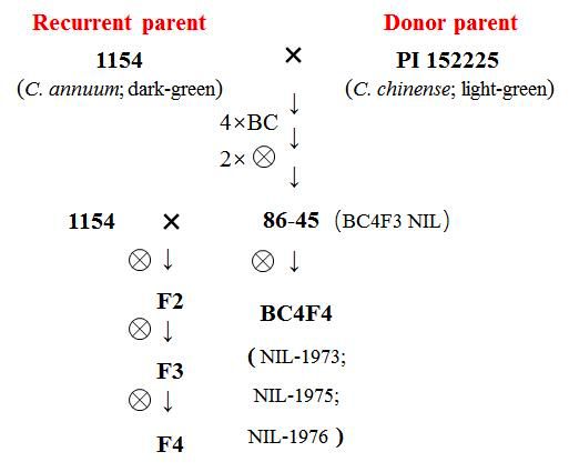 1. 群體構(gòu)建:1154(深綠;C. annuum),PI 152225(淡綠;C. chinense);86-45(BC4F3 NIL,含來自PI152225的pc1區(qū)段)(圖 1.及圖 2.)