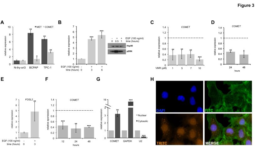 BRAF樣PTC的特征在于ERK介導(dǎo)的轉(zhuǎn)錄程序的過(guò)度激活。這一點(diǎn)促使研究COMET表達(dá)是否在MAPK激活下游被誘導(dǎo)。因此,用表皮生長(zhǎng)因子(EGF)刺激Nthy-ori 3-1細(xì)胞中的RAS-RAF-MEK-ERK途徑。MAPK途徑的誘導(dǎo) – 通過(guò)早期p-Erk增加證實(shí)(圖3B,右圖) – 隨后COMET水平顯著增加(圖3B,左圖)。相反,使用化學(xué)和遺傳方法抑制BRAF突變的BCPAP細(xì)胞系中的組成型活性途徑,通過(guò)用vemurafenib阻斷過(guò)度活化的B-Raf蛋白(圖3C)或BRAF基因KD(圖3D),顯著降低COMET水平。之后評(píng)估了COMET細(xì)胞定位,與qPCR偶聯(lián)的RNA分級(jí)分析顯示,與內(nèi)參蛋白質(zhì)編碼基因(GAPDH)類(lèi)似,COMET在細(xì)胞質(zhì)RNA部分中具有明顯富集(圖3G)。此外,RNA FISH進(jìn)一步證實(shí)了這種新的NAT lncRNA的細(xì)胞質(zhì)定位(圖3H)。