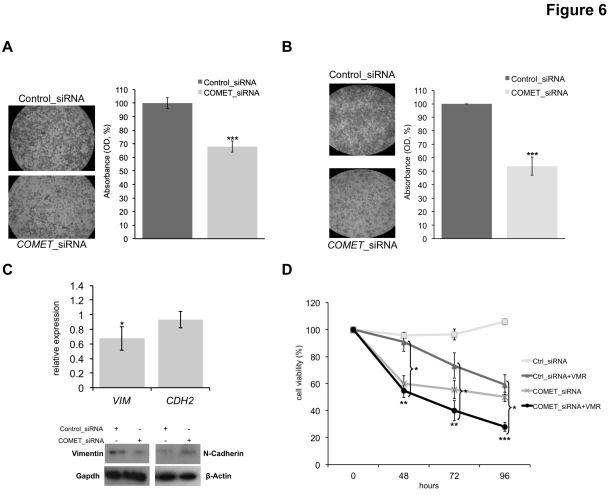 據(jù)報(bào)道,受體酪氨酸激酶(RTK),特別是c-Met受體的激活是腫瘤細(xì)胞逃避vemurafenib(VMR,維莫非尼)介導(dǎo)的突變體B-Raf蛋白抑制的機(jī)制。由于作者數(shù)據(jù)支持COMET可作為MET新的調(diào)節(jié)劑,猜測(cè)它是否也可能作用于BRAF突變的腫瘤細(xì)胞中的vemurafenib反應(yīng)機(jī)制。首先,與TPC-1細(xì)胞類(lèi)似,評(píng)估COMET沉默對(duì)BRAFV600E突變的BCPAP細(xì)胞系的生存力(高達(dá)50%)具有強(qiáng)烈影響(圖6D),伴隨MET水平的下降。當(dāng)用VMR處理BCPAP時(shí),也表現(xiàn)出了類(lèi)似的效果(高達(dá)60%的細(xì)胞存活率降低)。因此,將敲低COMET的BCPAP細(xì)胞暴露于VMR,以評(píng)估組合治療是否可發(fā)揮累加效應(yīng)。有趣的是,圖6D中數(shù)據(jù)表明,與對(duì)照細(xì)胞(即僅用VMR處理和/或用對(duì)照siRNA轉(zhuǎn)染的細(xì)胞,圖6D)相比,COMET敲低的 BCPAP細(xì)胞具有顯著增強(qiáng)的VMR敏感性,表明在BRAFV600E突變腫瘤中COMET是提高化療的新靶標(biāo)。