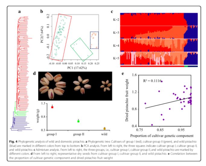 基于重測序數(shù)據(jù),研究人員推測了這些物種的有效群體大小的變化,并發(fā)現(xiàn)在 Pleistocene期間發(fā)生了瓶頸事件,且在 ~200 kyr前,有效群體大小增加。系統(tǒng)發(fā)育樹顯示馴化和野生開心果之間的分離(圖4a)。利用δaδi推算野生和馴化開心果的分化時間在 ~8000年前,這與早在公元前6750年就表明開心果種子是一種常見的食物這一考古記錄相似。為了深入了解開心果種質(zhì)之間的遺傳關(guān)系,研究人員進行了兩項經(jīng)典分析:群體結(jié)構(gòu)和主成分分析(圖4b,c)。這些分析清晰的顯示栽培種質(zhì)分為兩個群。栽培種Group I的LD最高,栽培種Group II和野生開心果的LD衰減值相近。Group II包括 Qazvini,Italiaei和Badami