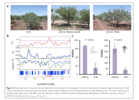 在本研究中,為了更好地了解開心果馴化的分子進化歷史,研究人員組裝了開心果的基因組草圖,并對107個全基因組進行了重測序,包括93個馴化和14個野生的開心果以及35個不同野生黃連木屬物種。整合基因組和轉(zhuǎn)錄組學分析顯示,擴張的基因家族(如細胞色素P450和幾丁質(zhì)酶)和茉莉酸(JA)生物合成途徑可能參與應(yīng)激適應(yīng)。比較群體基因組分析顯示,開心果大約在8000年前被馴化,馴化的關(guān)鍵基因可能是那些涉及樹木和種子大小的基因,這些基因經(jīng)歷了人工選擇。這些基因組序列應(yīng)該有助于未來的研究,以了解沙漠作物的農(nóng)業(yè)和環(huán)境相關(guān)特性的遺傳基礎(chǔ)。