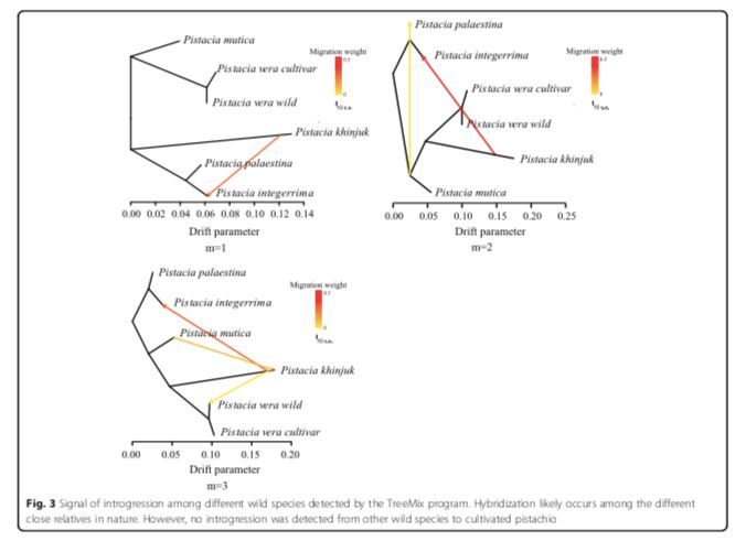 為了研究開心果的種群歷史和適應(yīng)性進化,研究者對107個開心果基因組進行重測序,包括93個品種和14個野生開心果,平均測序深度為6-8X。作者還重新測序了來自不同近緣種的35個基因組,包括P.mutica,P.khinjuk,P.integerrimaP. palaestina。用stringent GATK pipeline,發(fā)現(xiàn)14.77百萬個單基因變異位點,其中2.42百萬個在基因區(qū)。使用鄰近法和最大似然法的系統(tǒng)發(fā)育分析清楚地分離了5種不同的種群,即?P.vera, P.mutica, P. khinjuk, P. integerrima, and P. palaestina。通過TreeMix程序在一些物種之間檢測到漸滲的信號,這表明雜交可能在自然界中的不同近親之間發(fā)生,并且與植物中被發(fā)現(xiàn)的普遍雜交一致。然而,從其他開心果物種到馴化的開心果沒有檢測到漸滲,這種現(xiàn)象來源于野生的P. vera(圖3)。