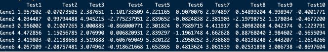 為了模擬不同樣品和基因之間的差異,我們將第一行到第10行中奇數(shù)列的數(shù)值全部加3,將第11行到第20行的偶數(shù)列數(shù)值全部加2,將15行到20行的偶數(shù)列全部加4。最后將列名命名為Test1 ~ Test10,將行名命名為Gene1~Gene 20,最終生成的數(shù)據(jù)格式如下圖