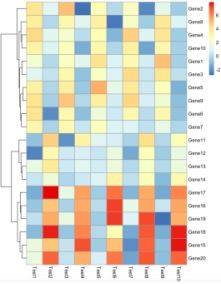 # 加載軟件包 library('pheatmap') # 生成繪圖用的數(shù)據(jù) test = matrix(rnorm(200), 20, 10) test[1:10, seq(1, 10, 2)] = test[1:10, seq(1, 10, 2)] + 3 test[11:20, seq(2, 10, 2)] = test[11:20, seq(2, 10, 2)] + 2 test[15:20, seq(2, 10, 2)] = test[15:20, seq(2, 10, 2)] + 4 colnames(test) = paste("Test", 1:10, sep = "") rownames(test) = paste("Gene", 1:20, sep = "")