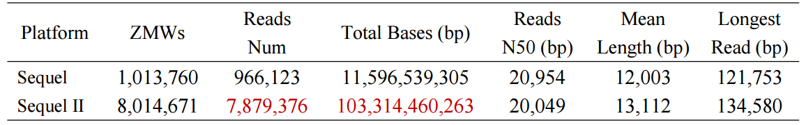 百邁客利用某海洋動(dòng)物樣本通過構(gòu)建相同文庫,進(jìn)行不同平臺(tái)的數(shù)據(jù)測(cè)試。通過構(gòu)建20 Kb的文庫,同時(shí)在Sequel與SequelⅡ上進(jìn)行上機(jī)測(cè)序,數(shù)據(jù)產(chǎn)出結(jié)果如下所示: