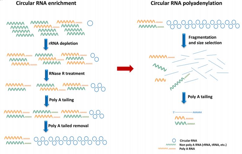 只有一小部分RNA是環(huán)狀的(例如,小鼠神經(jīng)系統(tǒng)中去rRNA的RNA庫中僅占約0.1%)。作者采用上述方法進(jìn)行circRNA-ONT測序,由于有些線性RNA分子對RNase R具有抗性,故而此方法比普通的去線性circRNA建庫多了一步:將剩余的線性RNA多聚腺苷酸化(poly A tailing)并使用poly(A)純化磁珠去除帶polyA尾的RNA分子。結(jié)果表明,該步驟使circRNA強(qiáng)烈富集。