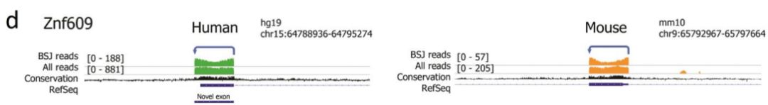 將circRNA根據(jù)新外顯子使用分類為“隱蔽的circRNA外顯子”(與注釋的外顯子共享5’或3’剪接位點)或“獨特的circRNA外顯子”(全新的外顯子)。人類2,393個外顯子中的91個和小鼠中2,487個外顯子中的82個是獨特的circRNA外顯子,140和163個分別是隱蔽的circRNA外顯子。(所有單外顯子circRNA都被排除在該分析之外,因為在單個read中需要完全覆蓋檢測到的外顯子,這對于單個外顯子circRNA而言在技術(shù)上是不可能的。)作者發(fā)現(xiàn)大多數(shù)獨特的circRNA外顯子在40-200bp范圍內(nèi),但也經(jīng)常觀察到3-6bp的非常短的外顯子(微外顯子)組。有趣的是,大多數(shù)circRNA特異性外顯子導(dǎo)致移碼突變或終止密碼子獲得,可能解釋了它們在線性mRNA翻譯中缺失,因此受到無義介導(dǎo)降解。