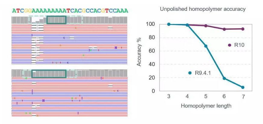 同聚物的識別準(zhǔn)確性是大家一直都比較關(guān)心的問題,從ONT官方釋放的測試結(jié)果顯示,相比于R9.4.1,R10版本芯片能夠顯著提高其在同聚物區(qū)域的堿基識別準(zhǔn)確度,并且?guī)缀醪粫肴笔уe誤(圖5)。
