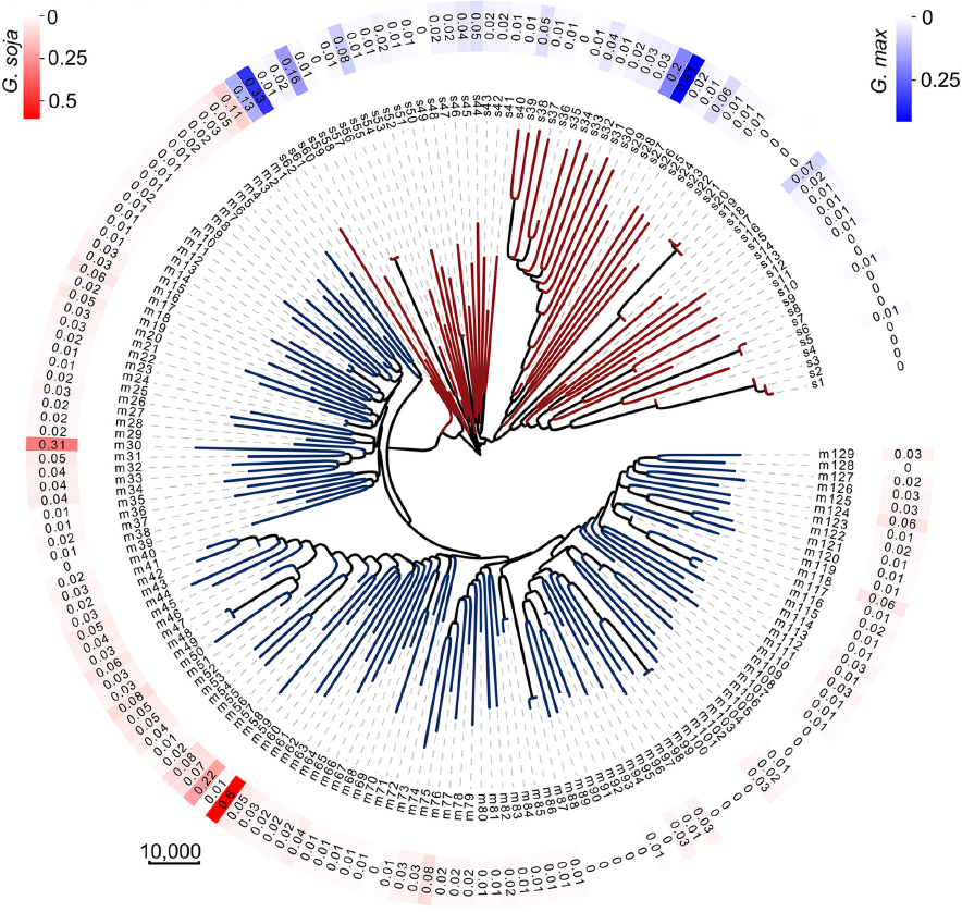 基因滲入被認為是基因流的主要途徑,那么基因流如何在種群水平上影響馴化過程和大豆基因組的遺傳結構?現(xiàn)有研究已分離出分別控制種子硬度和種皮開花的關鍵大豆馴化基因GmHs1-1和Bloom1(B1),圍繞GmHS1-1、Gmhs1-1和B1、b1基因座的兩個選擇性掃除區(qū)域中的SNP分析系統(tǒng)發(fā)育關系發(fā)現(xiàn)基因滲入現(xiàn)象在這兩個區(qū)域均有存在??紤]到野生大豆和栽培大豆亞種的系統(tǒng)發(fā)育差異,在研究種群中兩個馴化基因位點檢測到的選擇性掃描區(qū)域和單倍型的混合將被視為亞種群間基因流動的進一步證據(jù)。