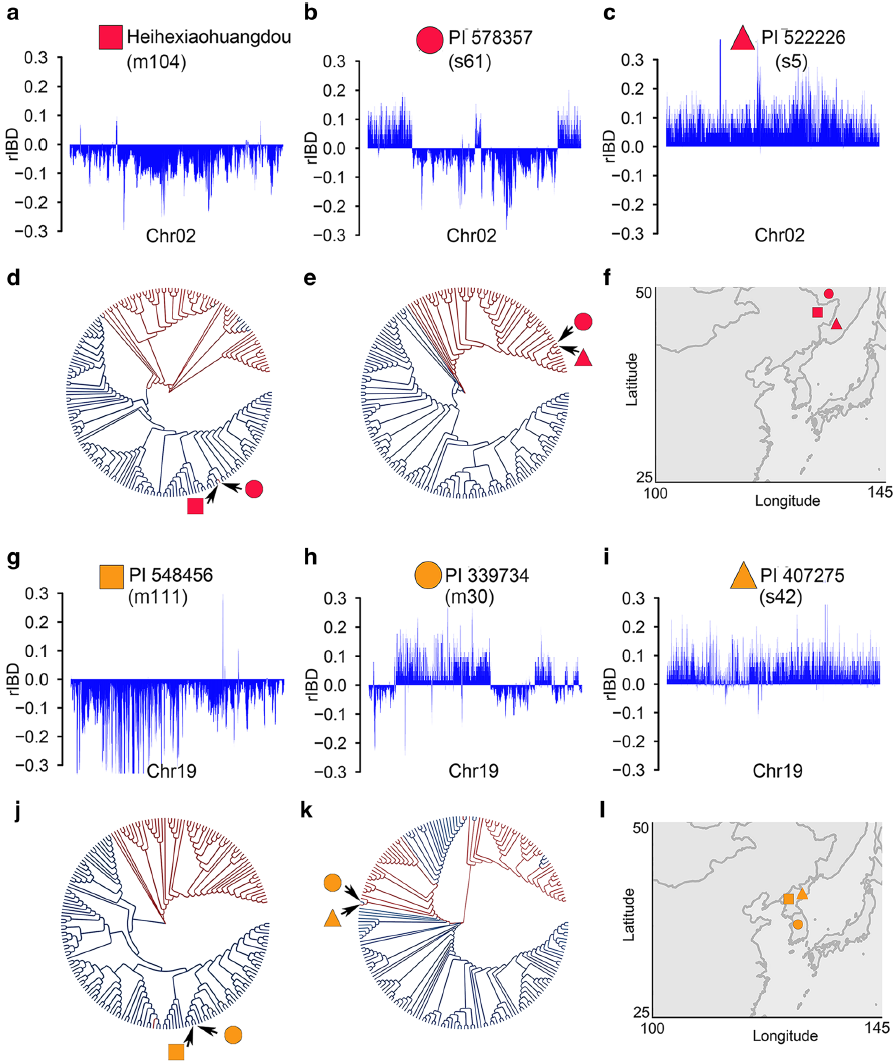(a-c)黑河小黃豆, PI 578357和PI 52226三個材料中基因組成分在2號染色體的分布(d)基于2號染色體基因滲入?yún)^(qū)域SNP構建的進化樹揭示的PI 578357中PI 52226成分的起源(e)基于2號染色體非基因滲入?yún)^(qū)域SNP構建的進化樹揭示的PI 578357中黑河小黃豆成分的起源(f)上述三個材料的地理分布(g-i) PI 548456, PI 339734和PI 407275三個材料中基因組成分在19號染色體的分布(j)基于19號染色體基因滲入?yún)^(qū)域SNP構建的進化樹揭示的PI 339734中PI 548546成分的起源(k)基于19號染色體非基因滲入?yún)^(qū)域SNP構建的進化樹揭示的PI 339734中PI 407275成分的起源(l)上述三個材料的地理分布