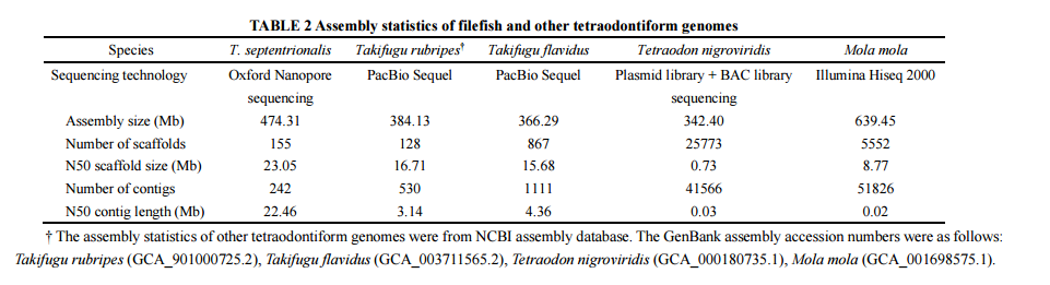 而與近年的一些魚(yú)類基因組ContigN50相比,綠鰭?cǎi)R面鲀基因組組裝的連續(xù)性同樣也是表現(xiàn)超群。從表2中不難發(fā)現(xiàn),近年來(lái)魚(yú)類基因組ContigN50水平基本在Kb與Mb之間徘徊,而本次使用Nanopore組裝的綠鰭?cǎi)R面鲀直接上升了一個(gè)數(shù)量級(jí),完成了連續(xù)性超強(qiáng)的優(yōu)質(zhì)基因組。