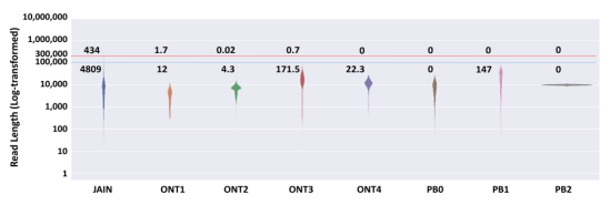 通過雙平臺實測數(shù)據(jù)的比較分析: Nanopore平臺平均讀長為28.5 Kb左右,Reads N50平均讀長 38Kb左右;PacBio CLR平均讀長20 Kb左右,Reads N50平均讀長 28Kb左右;CCS平均讀長12-15 Kb,Reads N50 16~18Kb,發(fā)現(xiàn)Nanopore比PacBio平臺讀長高10 Kb左右,而PacBio CCS模式讀長遠(yuǎn)低于CLR模式。
