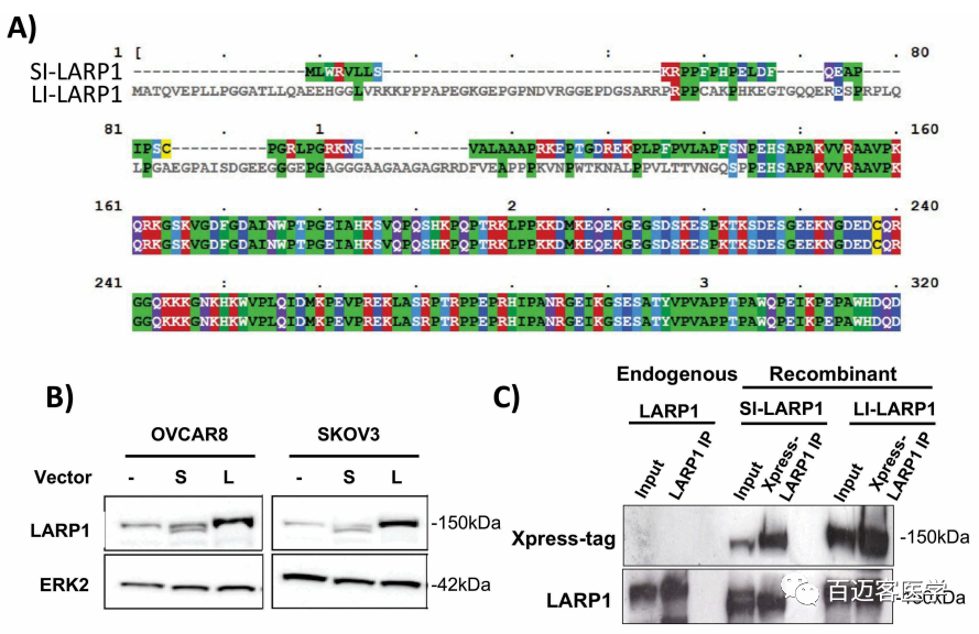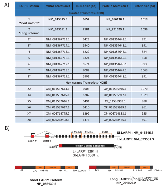 圖1A為NCBI基因數(shù)據(jù)庫中列出的9種不同的LARP1經(jīng)驗(yàn)證的isoform。LARP1典型轉(zhuǎn)錄本為NM_015315.5,編碼1019個(gè)氨基酸(NP_056130.2)的蛋白質(zhì),在此處稱為“ SI-LARP1”。UniProtKB數(shù)據(jù)庫引用了另一個(gè)比較長的轉(zhuǎn)錄本NM_033551.3作為LARP1的規(guī)范形式,它對應(yīng)于1096個(gè)氨基酸蛋白(NP_291029.2),在此稱為“LI-LARP1” 。SI-LARP1蛋白與LI-LARP1不同,它缺少前77個(gè)氨基酸,并且氨基酸M1至N67不同。