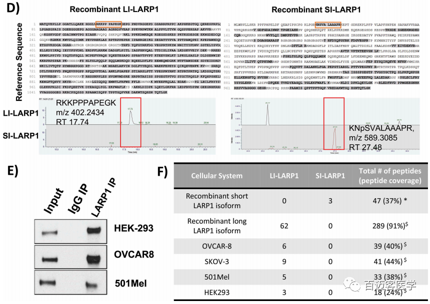 為了驗(yàn)證這一點(diǎn),首先,在OVCAR-8細(xì)胞中異位表達(dá)了2種LARP1 isoform,并使用針對共表達(dá)的Xpress標(biāo)簽的抗體從粗蛋白裂解物中免疫沉淀富集LARP1蛋白(圖4C)–pull down實(shí)驗(yàn)。隨后,使用胰蛋白酶或胰凝乳蛋白酶對樣品進(jìn)行溶液消化后,Shotgun LC MS/MS質(zhì)譜分析以鑒定對應(yīng)于SI-或LI-LARP1 isoform的N端特異性肽段。鑒定了從序列位置45和46產(chǎn)生的3種肽(質(zhì)量為N46SVALAAAPR:485.2773 Th(m/z); K45NpSVALAAAPR:549.3257 Th(m/z); K45NSAVALAAAPR:589,3085 Th(m/z ))作為SI-LARP1的唯一特征(圖4D)。相反,對于LI-LARP1,鑒定了由與外顯子1對應(yīng)的蛋白質(zhì)序列產(chǎn)生的152個(gè)肽。第二步,免疫沉淀富集OVCAR-8、501-MEL、SK-OV-3和HEK-293T細(xì)胞的內(nèi)源LARP1,并進(jìn)行質(zhì)譜分析,使用監(jiān)督自動算法檢測預(yù)先指定的isofrom特異性肽(圖4E-F)。LARP1的肽覆蓋率范圍為內(nèi)源性免疫沉淀蛋白的24-44%。盡管在所有4個(gè)細(xì)胞系中都鑒定出了與LI-LARP1 N端相對應(yīng)的獨(dú)特肽,但我們無法在任何樣品中鑒定出對SI-LARP1亞型具有特異性的任何肽。這些結(jié)果與觀察到的不存在對應(yīng)于SI-LARP1的mRNA相一致。