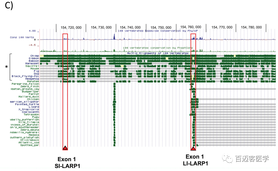 接下來,作者對SI-LARP1是否可以發(fā)揮獨(dú)特的功能作用感興趣。為此分析了2種LARP1亞型的TSS區(qū)保守水平(圖5C)。作者假設(shè),進(jìn)化保守將暗示選擇性壓力,因此每種亞型的作用不同。為了解釋LARP1亞型的進(jìn)化保守性,使用UCSC基因組瀏覽器在脊椎動物(鳥類、魚類、兩棲動物、爬行動物、哺乳動物)亞門上生成了100個(gè)可用LARP1序列的多序列比對。出乎意料的是,LI-LARP1外顯子1在整個(gè)亞科中都具有很強(qiáng)的保守性,但SI-LARP1外顯子1的保守性僅存在于胎盤動物分支中,其中包括人類和其他靈長類動物。這表明它可能在胎盤哺乳動物的進(jìn)化晚期獲得了功能性作用。相比之下,LI-LARP1的保守性跨多個(gè)進(jìn)化分支表明作用更為古老。
