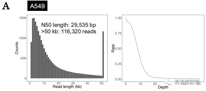 在完成對從MinION和PromethION數(shù)據(jù)的初步評估后,作者對另外4個肺癌細(xì)胞系(A549、REFF-LC-KJ、RELF-LC-MS和PC-14)進行了MinION和PromethION測序,分別覆蓋了9.5-18.5X基因組,例如,在RERF-LC-KJ測序中,產(chǎn)生了5,986,875個reads(總堿基數(shù)57,062,227,853 bp,18.5x),Reads*長長度和N50長度分別為922,768 bp和23,442 bp。