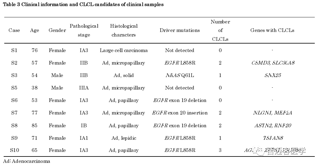 為了檢查臨床肺癌肺腺癌病例中是否也存在CLCL,對9名日本肺腺癌患者的手術(shù)標(biāo)本進行了類似的PromethION全基因組測序(表3)。表3中顯示了每個患者所檢測到的驅(qū)動基因突變。平均每個case生成了43,953,136,203 bp的序列(深度大于10倍)。對于S10病例,還對正常組織標(biāo)本進行了測序,以消除可能的正常組織變異和源自比對錯誤的可疑CLCL。
