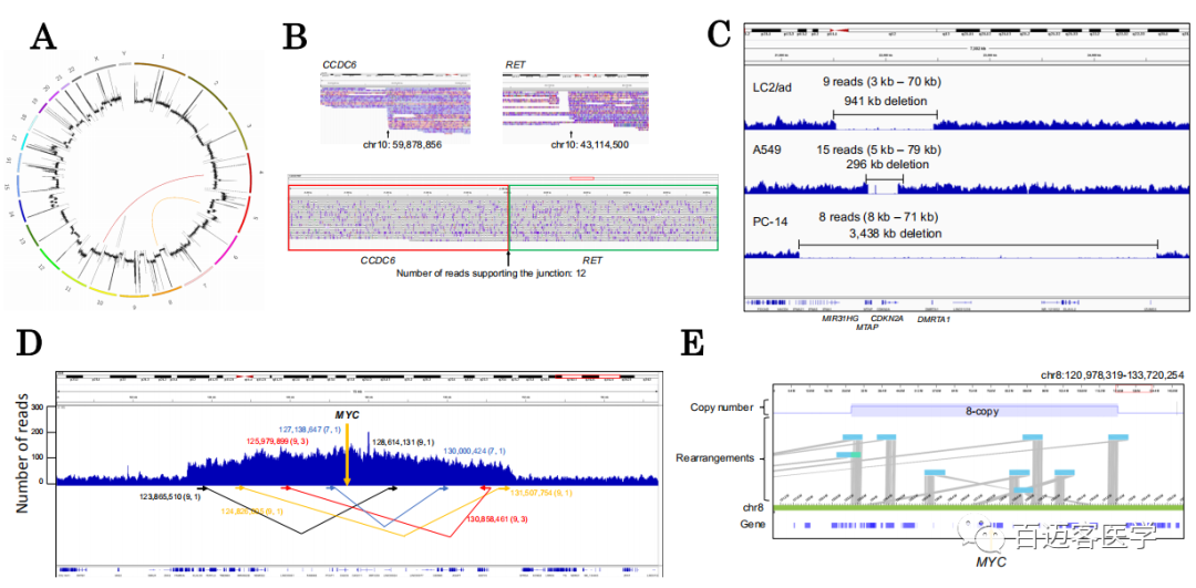 在其他細(xì)胞系中也成功鑒定出以下數(shù)量的CLCL:LC2/ad中有16個,A549中有1個,RERF-LC-KJ中有7個,RELF-LC-MS中有7個,PC-14中有11個。重要的是,CLCLs甚至出現(xiàn)在關(guān)鍵的癌癥基因中,例如STK11,NF1,SMARCA4和PTEN基因。異常的結(jié)構(gòu)各不相同,并且由于其復(fù)雜的結(jié)構(gòu)和受累區(qū)域的大小,傳統(tǒng)的基于短讀長測序分析的方法不易檢測到它們中的大多數(shù)。相對簡單的一種是在RERF-LC-MS細(xì)胞的NF1基因中檢測到的(圖3B),內(nèi)含子9(chr17:31,200,948)和最后一個外顯子36的下游區(qū)域(chr17:31,278,880;在交界處有6條reads支持)之間的串聯(lián)串聯(lián)重復(fù)。在另一種情況下,SMARCA4 CLCL的結(jié)構(gòu)顯示出從內(nèi)含子1(chr19:10,973,314)到內(nèi)含子20(chr19:11,022,573;在交界處有8條reads支持;圖3C)。在PC-14中的PTEN結(jié)構(gòu)中發(fā)現(xiàn)了更復(fù)雜的情況,該CLCL是倒位和缺失的組合(圖3D)。在這些相對簡單的情況下,將Illumina短reads重新映射到已發(fā)現(xiàn)的junction位點可驗證重建結(jié)構(gòu)的√確識別。