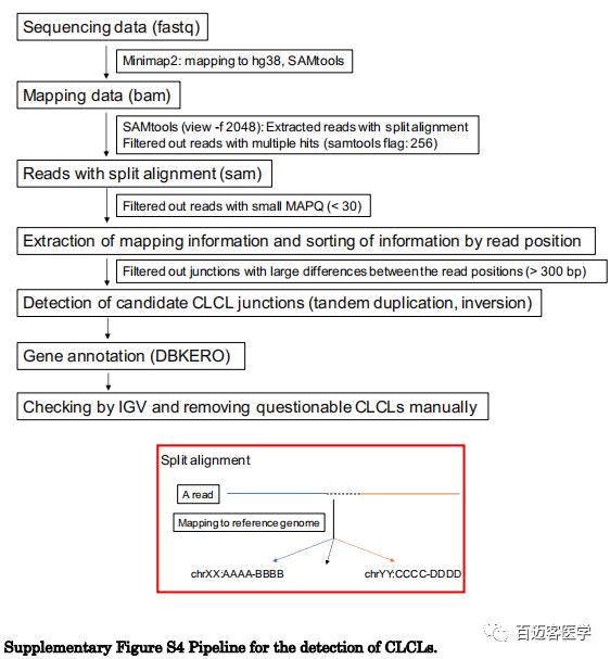 為了更普遍地識別所有肺癌細(xì)胞系其他基因座中的CLCL,作者構(gòu)建了一條新的分析性生物信息學(xué)流程。簡而言之,利用了來自比對結(jié)果的split比對信息,根據(jù)reads位置對比對信息進行排序,并提取了候選CLCL。相關(guān)的reads被重組以重建其結(jié)構(gòu)。