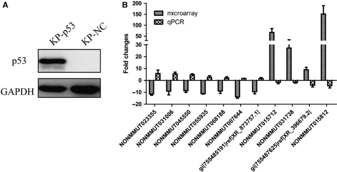 p53是臨床肺癌中最常見的突變抑癌基因,在我們的肺腺癌小鼠模型和KP細(xì)胞中均被誘導(dǎo)完全敲除。因此,作者探索了所選擇的210個(gè)保守的lncRNAs的非調(diào)控表達(dá)是否與p53的缺失有關(guān)。攜帶p53基因的慢病毒顆??稍贙P細(xì)胞中重新表達(dá)p53。如下圖A所示,p53在穩(wěn)定感染的KP細(xì)胞中有效地重新表達(dá)。qPCR結(jié)果顯示,p53再表達(dá)顯著改變了11個(gè)lncRNAs的表達(dá)(FC≥1.5),且差異倍數(shù)與上述p53缺失的肺腺癌組織芯片數(shù)據(jù)相反(圖B),表明p53的再表達(dá)對(duì)LncRNAs的表達(dá)有顯著影響。