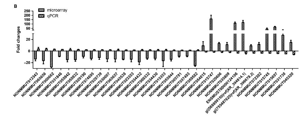 使用芯片技術(shù)檢測(cè)lncRNA,差異表達(dá)lncRNAs的散點(diǎn)圖和聚類圖顯示了肺腺癌和正常肺樣本之間有明顯區(qū)別(圖A、B)。重點(diǎn)研究了在人和鼠之間具有較高差異倍數(shù)且保守的lncRNAs,當(dāng)FC>8,P<0.05時(shí),鑒定到729個(gè)lncRNA。根據(jù)染色體位置保守性和序列保守性,篩選出210個(gè)具有潛在人類同源物的lncRNA用于后續(xù)驗(yàn)證,其中129個(gè)上調(diào),81個(gè)下調(diào)(圖C、D)。根據(jù)其基因組位置,將210個(gè)lncRNA分為u(基因間)、i(內(nèi)含子)、x(反義)和o(正義重疊)四大類。已鑒定的lncRNAs大部分屬于i類,有101個(gè)(48.09%)(圖E)。
