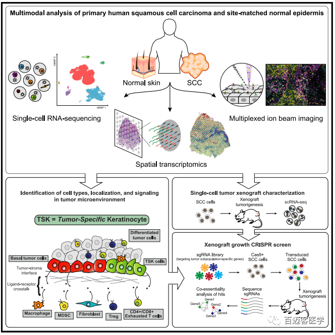 為了定義皮膚鱗狀細(xì)胞癌(cSCC)的細(xì)胞組成和結(jié)構(gòu),本研究結(jié)合單細(xì)胞轉(zhuǎn)錄組測(cè)序、空間轉(zhuǎn)錄組和多路復(fù)用離子束成像技術(shù),對(duì)一系列人皮膚鱗狀細(xì)胞癌和與之匹配的正常皮膚進(jìn)行分析。結(jié)果顯示cSCC存在四種腫瘤細(xì)胞亞群,三種與正常組織一致,第四種是癌癥所特有的腫瘤特異性角化細(xì)胞(TSK),并且定位于維管組織的生態(tài)位。整合單細(xì)胞測(cè)序和空間數(shù)據(jù)映射配體-受體網(wǎng)絡(luò)到特異的細(xì)胞類(lèi)型,揭示了TSK細(xì)胞是細(xì)胞通訊的中心。本研究還發(fā)掘了多種潛在的免疫抑制特征,包括Treg與CD8細(xì)胞在分隔的腫瘤間質(zhì)中的共定位。最后,通過(guò)人癌細(xì)胞的異種移植單細(xì)胞特征和體內(nèi)CRISPR篩選確定了腫瘤形成中特殊腫瘤亞群富集基因網(wǎng)絡(luò)的重要作用。這些數(shù)據(jù)明確了cSCC和基質(zhì)細(xì)胞亞群互作的空間生態(tài)位以及參與癌癥的基因網(wǎng)絡(luò)。