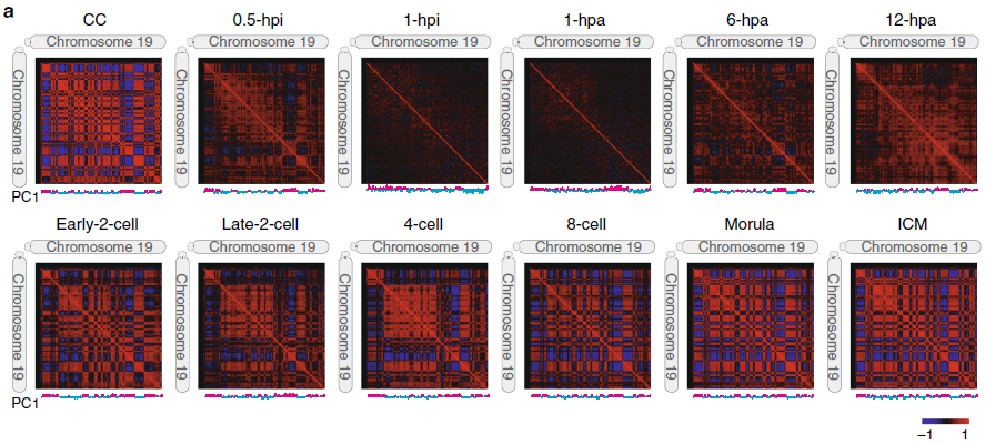 不同時期的胚胎的染色質三維構象見下圖,圖中分別展示了分辨率為100kb和40kb時的Hi-C互作矩陣。將CC(Cumulus cell)核注入無核卵母細胞后,染色質結構TADs和Compartments迅速溶解,并在6-hpa胚胎中部分恢復。令人驚訝的是,1-hpi和1-hpa單細胞胚胎遠端相互作用明顯較少,并顯示出一致的相互作用模式,這與中期染色質組織狀態(tài)高度相似。