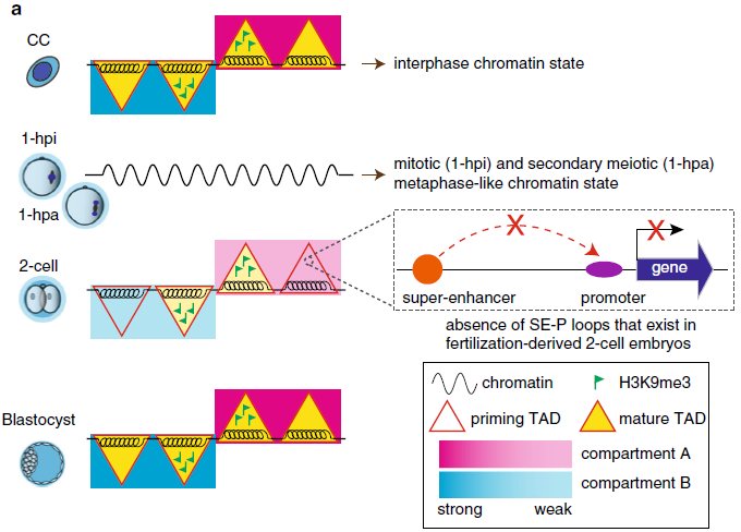 SCNT胚胎發(fā)育6小時(6-hpa)進入擬原核期(對應正常受精胚胎PN3時期)后,出現了較弱的TADs(拓撲相關結構域)信號,并持續(xù)減弱至早期2細胞期,在2細胞晚期到8細胞卵裂期逐步重新建立,直到囊胚期成熟。