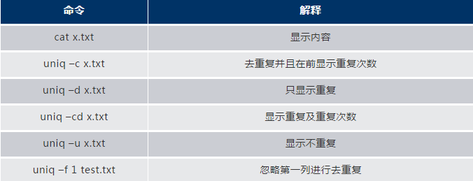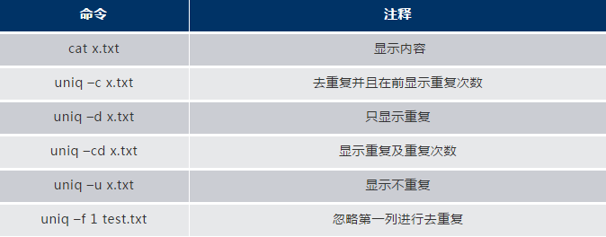 uniq需要配合sort進(jìn)行使用,把重復(fù)的內(nèi)容排序到一起,以下為最常用的幾個命令實例