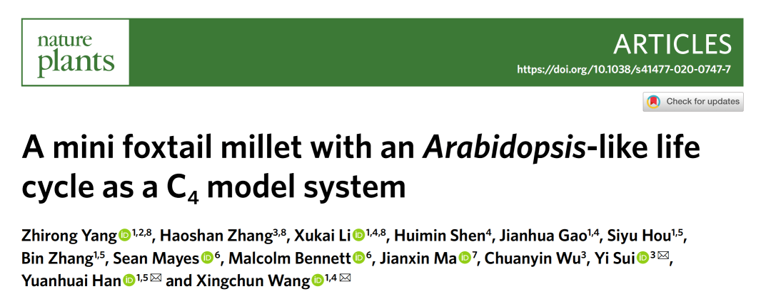 2020年8月31日,山西農(nóng)業(yè)大學(xué)雜糧分子育種團隊與中國農(nóng)業(yè)科學(xué)院作物科學(xué)研究所等單位合作研究論文“A mini-foxtail millet with an Arabidopsis-like life cycle as a C4 model system”在線發(fā)表于國際期刊Nature Plants(IF:13.256),報道了C4禾谷類研究的理想模式植物“小米”的研究成果。山西農(nóng)業(yè)大學(xué)的楊致榮教授、中國農(nóng)業(yè)科學(xué)院作物科學(xué)研究所的張皓珊博士和山西農(nóng)業(yè)大學(xué)的李旭凱副教授為論文的共同第一作者;山西農(nóng)業(yè)大學(xué)的王興春教授、韓淵懷教授和中國農(nóng)業(yè)科學(xué)院作物科學(xué)研究所的隋毅副研究員為論文的共同通訊作者。美國普渡大學(xué)和英國諾丁漢大學(xué)等單位參與了部分研究。百邁客有幸參與了其中基因組、轉(zhuǎn)錄組及數(shù)據(jù)庫構(gòu)建工作。目前,數(shù)據(jù)庫由百邁客負責(zé)維護和運行,暫時托管在公司服務(wù)器(http://foxtail-millet.biocloud.net/home)。