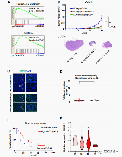 在眼黑色素瘤細(xì)胞中,在mRNA水平和蛋白水平均過表達(dá)HINT2。發(fā)現(xiàn)過表達(dá)HINT2后,眼黑色素瘤細(xì)胞的細(xì)胞增殖、細(xì)胞遷移、和克隆形成明顯受到抑制,細(xì)胞凋亡增加。此外,GSEA顯示在腫瘤細(xì)胞中HINT2促進(jìn)凋亡和細(xì)胞死亡(Fig3a)。為了確定HINT2在體內(nèi)腫瘤特征中的作用,過表達(dá)HINT2的眼黑色素瘤細(xì)胞進(jìn)行了皮下移植。結(jié)果顯示:相對于對照組(Fig3b, A組)來說,實驗組HINT2過表達(dá)組(Fig3b, B組)腫瘤體積持續(xù)降低。為了研究這些蛋白表達(dá)的變化是否在樣本中發(fā)生,在眼黑色素瘤和正常組織中進(jìn)行IF實驗(Fig3c),發(fā)現(xiàn)HINT2確實在腫瘤樣本中下調(diào)。除此之外,在眼黑色素瘤組織樣本中,低表達(dá)的HINT2與不良預(yù)后高度相關(guān)(Fig3e)。