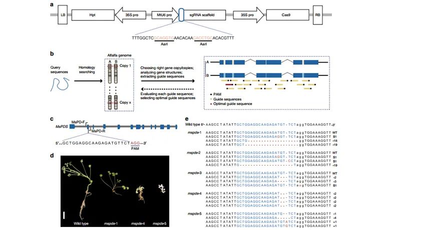 進(jìn)一步利用CRISPR/Cas9基因編輯系統(tǒng)對(duì)紫花苜蓿(Medicago sativa L.)中PDS基因(八氫番茄紅素合酶基因)和PALM1基因(編碼Cys(2)His(2) zinc finger transcription factor鋅指轉(zhuǎn)錄因子;在二倍體蒺藜苜蓿M. truncatula中,其對(duì)復(fù)合葉形態(tài)發(fā)生具有重要作用)進(jìn)行改造,進(jìn)一步確定不同單倍型變異對(duì)紫花苜蓿白化和矮化及葉復(fù)合形態(tài)表型性狀的影響。