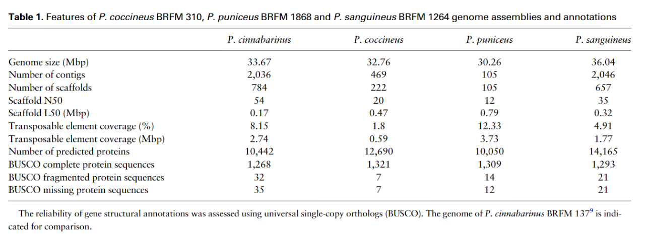 分別對(duì)P.coccineusP.sanguineusandP. puniceus、P.cinnabarinus的基因組進(jìn)行測(cè)序和組裝,四種真菌基因組大小差異不大,編碼基因組的數(shù)量上也比較接近。