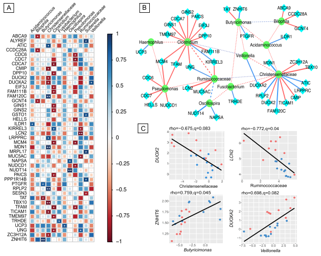 作者發(fā)現(xiàn)與健康對照相比,囊性纖維化患者的結(jié)腸中有1543個基因(CFTR)差異表達。這些基因富集于胃腸道和結(jié)直腸癌相關(guān)功能,如結(jié)直腸癌的轉(zhuǎn)移、腫瘤抑制、p53、mTOR信號通路等。囊性纖維化患者腸道菌群多樣性下降,產(chǎn)丁酸菌(Ruminococcaceae 和?Butyricimonas)減少,其他菌(Actinobacteria and Clostridium)豐度增加。結(jié)直腸癌相關(guān)基因(LCN2DUOX2)的表達與結(jié)直腸癌相關(guān)細菌(Ruminococcaceae 和Veillonella)豐度相關(guān)。