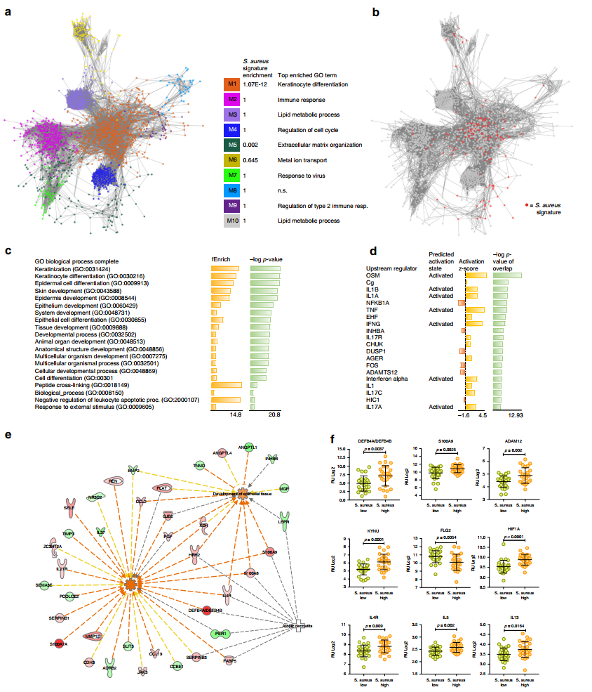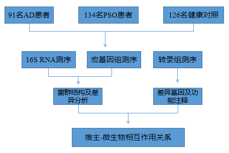 本文通過16S RNA測序、宏基因組測序及轉(zhuǎn)錄組測序技術(shù)研究了特異性皮炎和銀屑病患者皮膚微生物群落結(jié)構(gòu)以及皮膚基因表達模式。發(fā)現(xiàn)特異性皮炎和銀屑病與健康對照皮膚微生物組成存在顯著差異。特異性皮炎以金黃葡萄球菌為主并與宿主皮膚屏障功能、色氨酸代謝和免疫激活相關(guān)。銀屑病皮膚微生物群落與宿主基因表達存在微弱的關(guān)聯(lián)性。并為皮膚生態(tài)失調(diào)的生物標(biāo)志物和靶向治療提供基礎(chǔ)。