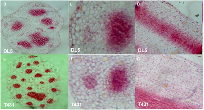 本研究利用石蠟切片法對(duì)其結(jié)構(gòu)變化及不育原因進(jìn)行觀察,觀察不育材料T431(圖1E)與對(duì)照材料(圖1B)成熟花柱的橫切,可以看出不育材料T431花柱中的維管束數(shù)目多于對(duì)照材料。同時(shí)形態(tài)觀察時(shí)發(fā)現(xiàn)不育材料花柱直徑顯著大于對(duì)照材料,維管束數(shù)目的增多可能直接導(dǎo)致了不育材料花柱直徑變大(圖1C, D, F, G)。觀察成熟花柱的細(xì)胞發(fā)現(xiàn)不育材料與對(duì)照材料花柱細(xì)胞大小沒有顯著差別。因此說明不育材料花柱伸長(zhǎng)是由花柱細(xì)胞數(shù)目增多導(dǎo)致而非細(xì)胞體積變大導(dǎo)致。