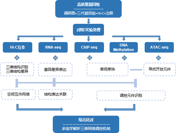 表觀遺傳(epigentics) “epi”表示“其上”或“超越”,genetics只設計基因的結構層次,而epigenetics則涉及基因如何發(fā)揮其功能以及基因間的互作關系。基因組結合表觀調(diào)控可更加深入的剖析物種在何時、何地、以何種方式去應用遺傳信息的指令。多種表觀遺傳研究手段間可相互組合,從三維基因、修飾表達、調(diào)控元件等多種層面解析不同調(diào)控原理。