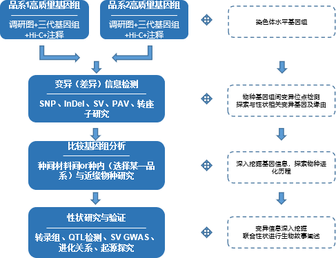 對于大部分動植物,其測序主要基于單一品種作為參考基因組。單一基因組測序通常只能覆蓋基因組的80%~90%,且通常只有代表馴化的優(yōu)良品種的單一基因型能夠被準確檢測到,因此不同生態(tài)型重測序數(shù)據(jù)一般只有50%~80%能比對到參考基因組上。而通過對兩種品系基因組進行denovo(或者與已發(fā)表品系進行研究),充分比較其間的基因組變異信息,可以更好的對不同生態(tài)型進行表型功能差異分析。結合兩種生態(tài)型品種雜交子代圖譜,將極大的利于后續(xù)性狀與功能研究。與動物相比植物更具有品種多樣性,因此該研究方案目前更多的應用于植物材料中。