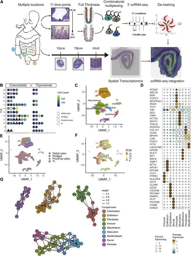 研究人員從代表了不同的發(fā)育時(shí)間和組織位置的17個(gè)單獨(dú)的胚胎中收集了77個(gè)腸道樣本繪制成單細(xì)胞圖譜 (Figures 1?A和1B),數(shù)據(jù)集范圍從8到22 PCW,跨越隱窩形成之前的時(shí)間點(diǎn),直至成人狀絨毛/隱窩形態(tài)的發(fā)展(FiguresS1A)。使用寡核苷酸標(biāo)記抗體,產(chǎn)生了76,592個(gè)細(xì)胞 (Figures 1A 和 S1B–S1I; STAR methods)。