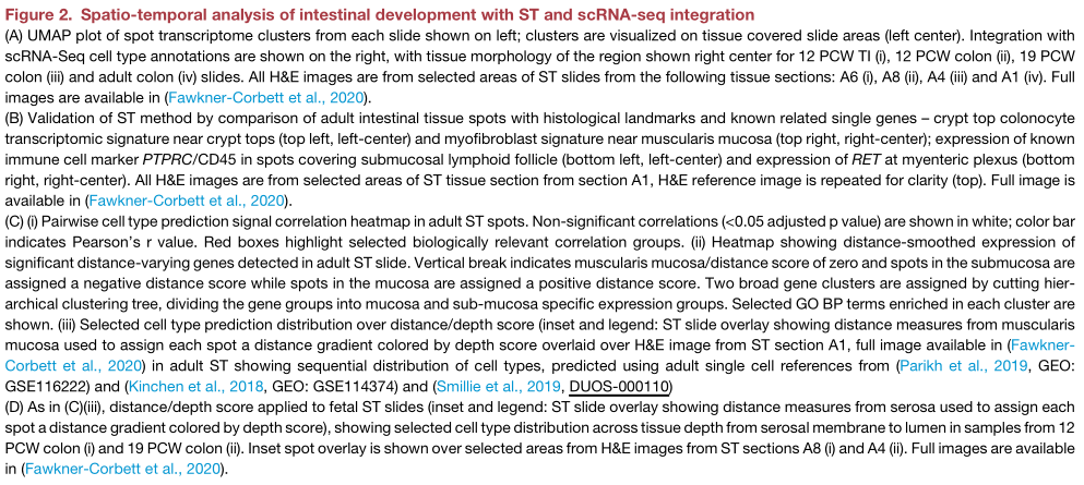 研究人員鑒定了2,893個(gè)與深度相關(guān)的基因(<5%FDR),反映了不同層次的活躍途徑(Figure Cii) -肌肉/神經(jīng)過(guò)程(收縮/軸突形成)向吸收管腔功能(微絨毛組織和消化系統(tǒng)過(guò)程)發(fā)展的深度富集點(diǎn),與細(xì)胞類型特征的順序富集相符(Figure?2Ciii)。在胎兒ST顯著的差異包括外肌層和內(nèi)肌層在19個(gè)PCW時(shí)占據(jù)離散的空間層,而不是12個(gè)PCW時(shí)(Figure 2D)。
