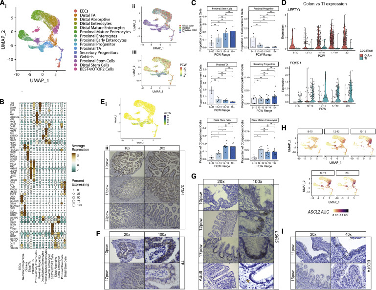 研究人員觀察到近端和遠(yuǎn)端ISCs隨著時(shí)間的推移逐漸增加。這與ISC轉(zhuǎn)錄程序的早期位置差異形成對(duì)比,例如遠(yuǎn)端LEFTY1和近端FOXD1及其下游調(diào)控網(wǎng)絡(luò)基因(Figure3C,3D和S3B)。這些差異由關(guān)鍵的位置信號(hào)轉(zhuǎn)通路支撐,例如,結(jié)腸LEFTY1通過(guò)激活素A受體(ACVR2B)參與了假定的神經(jīng)相互作FigureS3?C1)。在早期發(fā)育中(<12 PCW),研究人員發(fā)現(xiàn)了近端上皮干樣祖細(xì)胞群,該細(xì)胞群發(fā)展為早期腸上皮細(xì)胞。這些細(xì)胞表現(xiàn)出許多原始功能,包括在中胚層分化重要的VTN基因高表達(dá),與ISCs相比,LGR5表達(dá)較少,和ONECUT2表達(dá)參與上皮發(fā)育(Figure 3B和FigureS3?D)。這些細(xì)胞在SI中特異表達(dá)TF GATA4(Figure3Ei), SI是一種小鼠早期內(nèi)胚層調(diào)節(jié)因子,在12 PCW后,其表達(dá)大部分丟失這些細(xì)胞高表達(dá)轉(zhuǎn)鐵蛋白(TF)( Figure3B和3F),證實(shí)了鐵代謝在絨毛形成中的重要性。LGR5是一種典型的ISC基因,在妊娠早期(<12 PCW)的近端/遠(yuǎn)端廣泛檢測(cè)到低水平ISCs和干樣祖細(xì)胞(Figure3B和FigureS3D)。原位雜交(ISH)證實(shí)了在10PCW處彌漫的LGR5表達(dá),后來(lái)定位于隱窩堿基(Figure3G),類似于在雞和小鼠發(fā)育中報(bào)道的Lgr5的行為。即使在隱窩形態(tài)建立之后(如19 PCW之后),ISC仍分別構(gòu)成遠(yuǎn)端/近端樣本中捕獲的上皮細(xì)胞的18%–22%(Figure3C),高于成人結(jié)腸的scRNA-seq研究捕獲的3%-4%。與此相符,研究人員發(fā)現(xiàn)ASCL2?TF模塊(包括下游目標(biāo)LGR5)隨著發(fā)育時(shí)間的增加而顯著增加(Figure3H)。