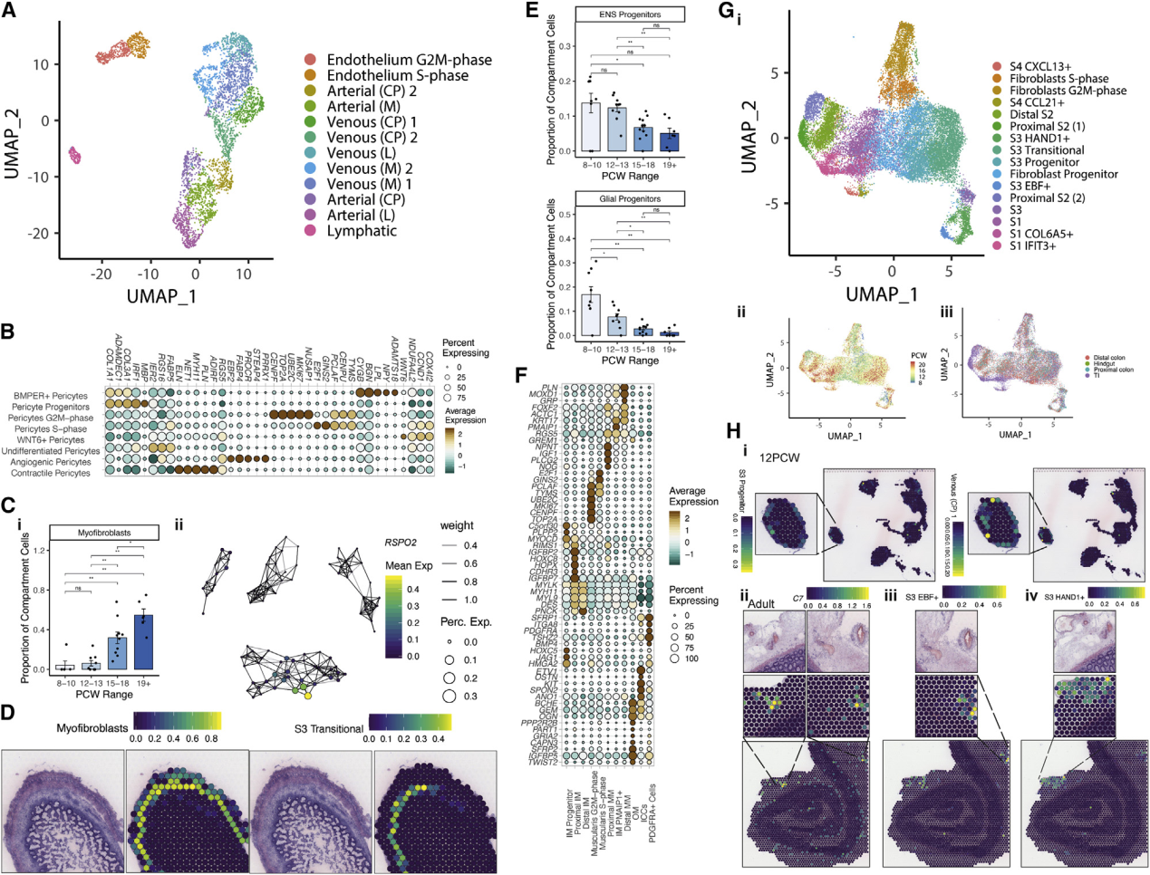 轉(zhuǎn)錄標(biāo)簽通常對(duì)應(yīng)于結(jié)構(gòu)特征。在EC中可以清楚地看到這一點(diǎn),將EC分為靜脈,動(dòng)脈和淋巴管類型,并通過(guò)血管大小進(jìn)一步區(qū)分(Figure4?A;TableS1)。在發(fā)育過(guò)程中,觀察到了從小血管到大血管的過(guò)渡,反映了腸道血管生成(Figure S4?A)。確定了驅(qū)動(dòng)這種變化的TF網(wǎng)絡(luò),例如動(dòng)靜脈分化器HEY1SOX13。成年ST的脈管系統(tǒng)很容易識(shí)別成年EC和胎兒EC信號(hào)(Figure S4?B)。與EC相對(duì)的,周細(xì)胞亞型由血管生成驅(qū)動(dòng)因子PRRX1,THBS4ANGPT2)定義(Figure 4?B;table S1)。ANGPT2是EC-周細(xì)胞RL相互作用的關(guān)鍵調(diào)節(jié)因子,已證實(shí)其位于胎兒脈管系統(tǒng)中(Figure S4C)。盡管EC隔室與8 PCW處存在的大血管細(xì)胞截然不同,但周細(xì)胞種群顯示出發(fā)育滯后。為了了解這些分化動(dòng)力學(xué),研究人員將G2M和S期周細(xì)胞與G1期細(xì)胞進(jìn)行了比較,發(fā)現(xiàn)在較早時(shí)間點(diǎn)的大多數(shù)細(xì)胞是高度循環(huán)的祖細(xì)胞(Figure S4?D)。這些種群與成纖維細(xì)胞和原始的ACTA2?+細(xì)胞共享轉(zhuǎn)錄特征,這一結(jié)果受到軌跡分析的支持(Figure S4?E)。綜上所述,提出了早期成纖維細(xì)胞向周細(xì)胞的轉(zhuǎn)變,然后是來(lái)自未成熟WNT6表達(dá)細(xì)胞的第二波周細(xì)胞增殖-分化。16 PCW時(shí),成熟的成肌纖維細(xì)胞表現(xiàn)出相似的發(fā)育滯后(Figure 4?Ci;table S1)。文獻(xiàn)表明腸道成肌纖維細(xì)胞可能來(lái)自多種來(lái)源,并且圖形抽象顯示成熟的成肌纖維細(xì)胞類似于肌肉細(xì)胞,在特定基因(例如RSPO2,F(xiàn)igure 4?Cii)中存在明顯差異。然而,肌成纖維細(xì)胞祖細(xì)胞卻表現(xiàn)出來(lái)自成纖維細(xì)胞和周細(xì)胞的梯度譜;在19 PCW的ST中,它們占據(jù)了與過(guò)渡間質(zhì)細(xì)胞相鄰和重疊的層。(Figure 4?D和S4?E)。