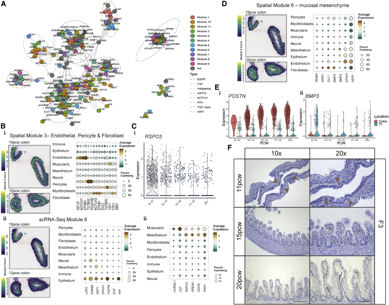 理解腸道發(fā)育的基本問(wèn)題是局部形態(tài)發(fā)生梯度及其拮抗劑是如何塑造腸絨毛形態(tài)發(fā)生的。研究人員創(chuàng)建了一個(gè)涉及8條途徑的基因形態(tài)發(fā)生圖,用以闡明這些分子在空間和時(shí)間上的作用。利用共表達(dá)分析確定了11種細(xì)胞類型特異性和13種空間共定位的形態(tài)發(fā)生模塊,在所有ST中對(duì)模塊活性進(jìn)行了評(píng)分(Figure5A和S7?A)。這些模塊通常與ST中的組織深度對(duì)齊,空間模塊3由來(lái)自EC、成纖維細(xì)胞和周細(xì)胞起源的形態(tài)發(fā)生子組成,包括LRP1,并且在組織深處(Figure5?Bi)。上皮特異性模塊表達(dá)了Hedgehog通路(IHH)的基因,例如在Wnt信號(hào)中起重要作用的卷曲的共受體LRP5,并位于管腔附近(Figure5?Bii)。另一個(gè)含有肌纖維母細(xì)胞成分的細(xì)胞,具有形態(tài)發(fā)生原WNT2B和受體RSPO2,在12PCW時(shí)出現(xiàn)彌漫性,并在以后逐漸定位(FigureS7?B)。這與發(fā)現(xiàn)成熟的成肌纖維細(xì)胞在上皮成分后出現(xiàn)的發(fā)現(xiàn)一致,表明ISC-成纖維細(xì)胞信號(hào)傳導(dǎo)回路直到隱窩形成后才建立。WNT2B由間皮表達(dá),在成肌纖維細(xì)胞分化之前提供了配體的唯一來(lái)源(FigureS7B)。類似地,RSPO3,其可以用信號(hào)通知經(jīng)由ISC的LGR5(FigureS7Ci)在間皮/肌層模塊中很高,主要在12 PCW之前見(jiàn)到,然后隨著時(shí)間的流逝隨著組織深度的增加而消失(Figure5C)。這表明,隨著腸的生長(zhǎng),原本可能因?qū)娱g物理距離的增加而被打破的形態(tài)梯度,可以通過(guò)依次發(fā)育的細(xì)胞類型的表達(dá)而恢復(fù)。