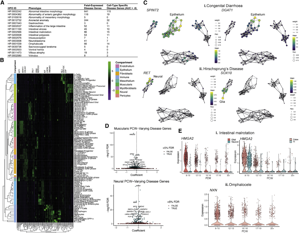 ????先天性腸道疾病的發(fā)病機(jī)制仍然是未知的,因?yàn)槿狈z傳缺陷的基礎(chǔ),而且子宮內(nèi)早期會(huì)發(fā)生一些異常。腸道腹側(cè)突出,伸長(zhǎng),旋轉(zhuǎn)和重新定位都發(fā)生在妊娠的前三個(gè)月,并且偏差可能導(dǎo)致諸如食管膨出等發(fā)育異常。為了揭示可能導(dǎo)致先天性腸道疾病的關(guān)鍵時(shí)間轉(zhuǎn)錄缺陷,研究人員將數(shù)據(jù)與人類表型本體論(HPO)中注釋了遺傳表型的圍產(chǎn)期腸道疾病的分類列表相關(guān)聯(lián)。通過(guò)將749個(gè)已知的疾病基因與scRNA-seq數(shù)據(jù)整合在一起,將先天性疾病與表型聯(lián)系起來(lái),這些表型可能通過(guò)高度細(xì)胞類型特異性缺陷(Figure7A和Figure7B)表現(xiàn)出來(lái),并導(dǎo)致腸道、腹側(cè)、會(huì)陰、神經(jīng)節(jié)、炎癥或腫瘤病理障礙(Figure7 A)。