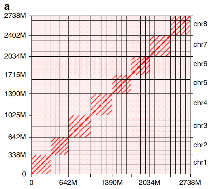 隨著單倍型的解析,不少研究發(fā)現(xiàn)在同源染色體間有大量的變異信息,而這些突變累積很可能引起等位基因的有害/有益替代。從而可以對亞基因組(同源染色體)間基因含量、GC含量、基因結(jié)構(gòu)、重復(fù)元件分布等比較、亞基因組間結(jié)構(gòu)變異(倒置、易位),結(jié)合TE分布等進(jìn)行亞基因組(同源染色體)間差異分析。