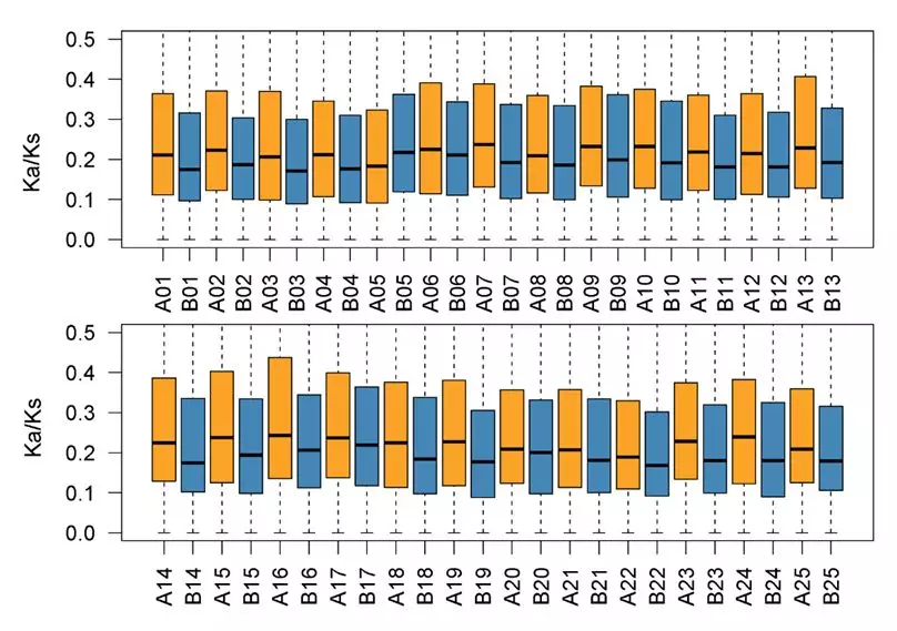 多倍體物種中,兩個(gè)亞基因組(同源基因組)所受到的選擇壓力往往不同:某亞(同源)基因組經(jīng)歷更強(qiáng)的純化選擇,另一個(gè)則經(jīng)歷較寬松的選擇,同源多倍體中可能同樣有這種現(xiàn)象。