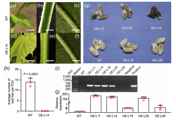為了進一步驗證GaFZ基因的功能,作者分別在擬南芥和有短絨的陸地棉中過表達GaFZ基因,發(fā)現(xiàn)轉基因擬南芥葉茸毛的發(fā)育收到了明顯的抑制,同時轉基因棉花株系的莖毛、葉茸毛和短絨的發(fā)育也均受到了不同程度的抑制(圖a-h);但是,轉基因棉花和擬南芥中根毛的數(shù)量均沒有發(fā)生變化;qRT-PCR分析顯示,過表達株系中GaFZ基因顯著高于野生型(圖4i-j);結果表明,GaFZ基因可以抑制葉茸毛和短絨纖維的發(fā)育,而對根毛的發(fā)育沒有抑制作用。