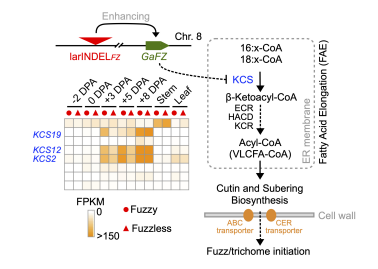 本研究通過對215份亞洲棉自然群體的種子短絨和無茸毛性狀進行全基因組關聯(lián)分析(GWAS),鑒定得到位于A08染色體末端的一個長度為6.2 kb的插入片段與短絨和葉茸毛表型顯著相關,并發(fā)現(xiàn)該片段可能扮演遠端增強子角色,可以特異激活其下游短絨發(fā)育關鍵基因GaFZ的表達。同時,在擬南芥和陸地棉中過表達GaFZ基因,發(fā)現(xiàn)GaFZ基因負調(diào)控短絨和葉茸毛的發(fā)育。進一步共表達和互作分析顯示,GaFZ基因可能通過抑制超長鏈脂肪酸伸長途徑中的基因表達來影響短絨和葉茸毛的發(fā)育。